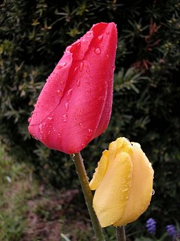 Red and yellow tulips on the south side of my house. It was misting outside, so water droplets are natural!